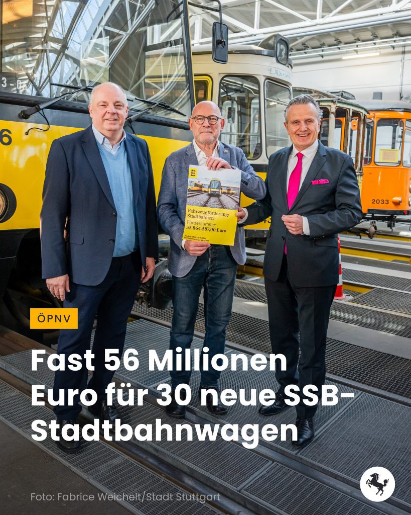 Im Stuttgarter Straßenbahnmuseum in Bad Cannstatt hat Landesverkehrsminister Winfried Hermann erfreulicherweise einen auf 56 Millionen Euro lautenden Förderbescheid für 30 neue Stadtbahnwagen an die Stuttgarter Straßenbahnen (SSB) übergeben. Vor zwei Jahren hat das Land der SSB bereits einen Zuschuss in Höhe von 84 Millionen Euro gewährt. Insgesamt fördert das Land Baden-Württemberg damit derzeit die Anschaffung von 70 neuen Stadtbahnwagen für den SSB-Fuhrpark mit rund 140 Millionen Euro und übernimmt 35 Prozent der Anschaffungskosten. Die verbleibenden 65 Prozent tragen die Landeshauptstadt Stuttgart und die SSB.